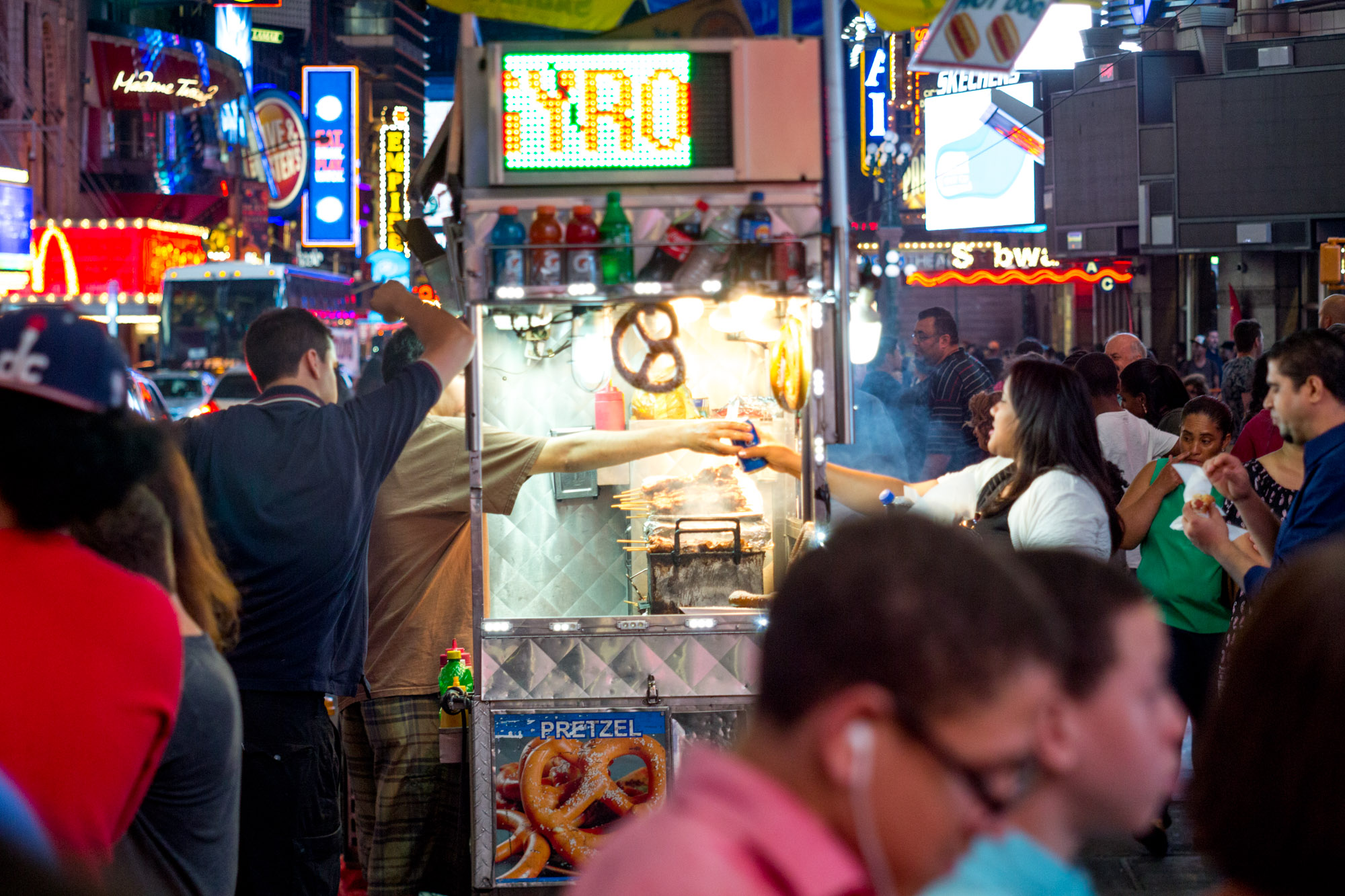 Street Food is one of New York Cities most iconic institutions. Walking off into the night exploring the city. Slowly passing cart after cart until the smell of halal and roasting kebabs fill your nostrils and you can’t take it anymore. Your feet start following the path your stomach is pulling you towards a street vendor. From inside a chef shouts wha-da-ya-havn? You look over the menu and peak inside the cart at the kebab skewers, slowly rotating hot dogs, and the giant pretzels glowing with oil and covered in salt.