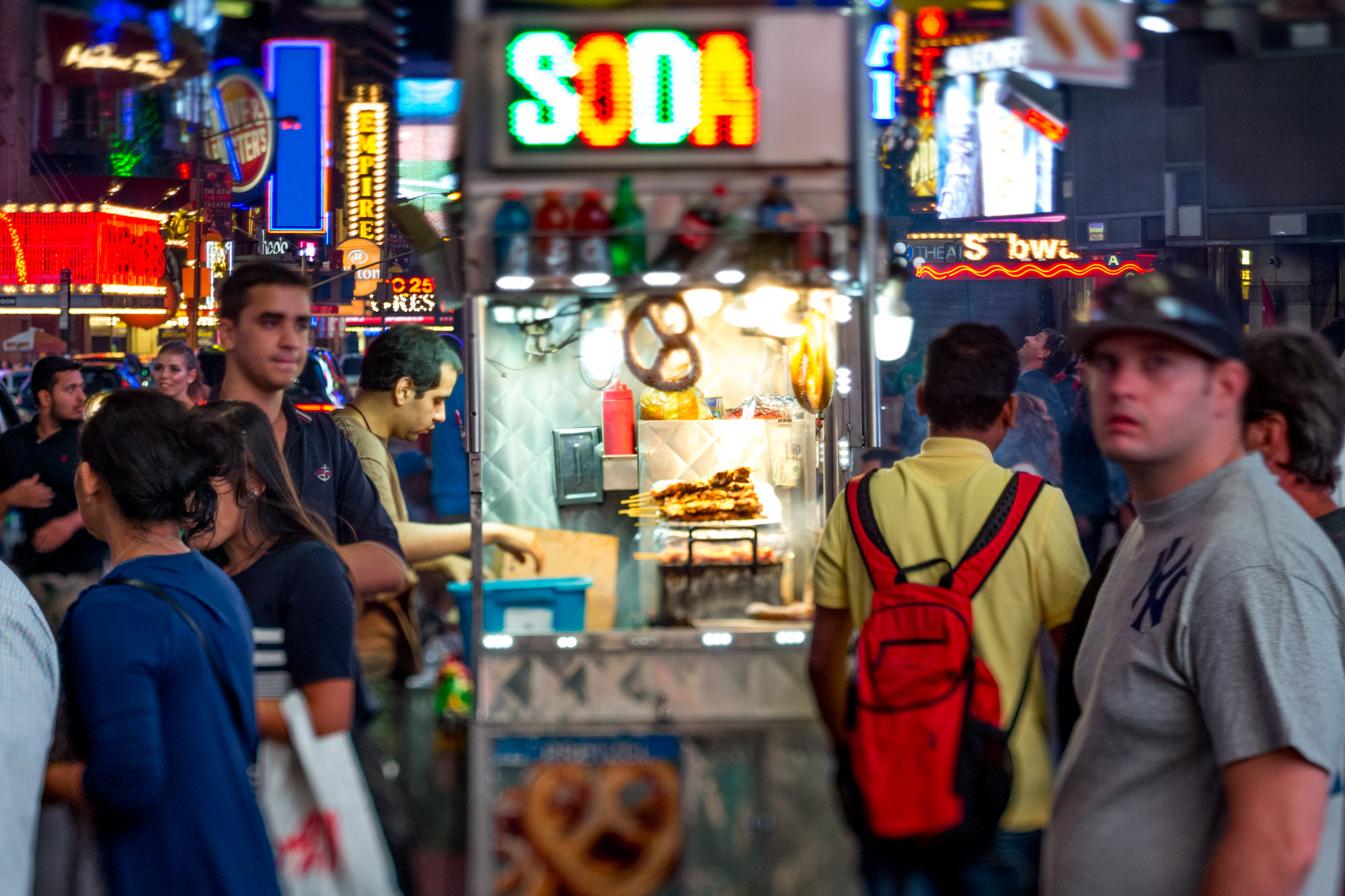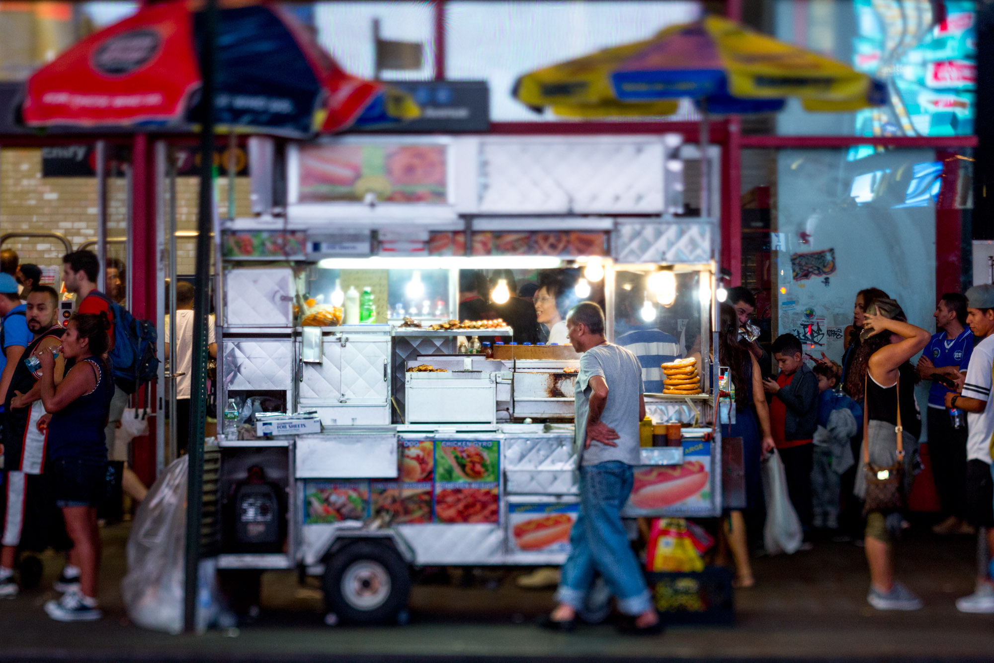 When you’re looking for a food cart you’re not necessarily looking for a culinary masterpiece. A work of perfect food art created by a master chef. You’re not going to find a lightly seasoned branzino paired with an aperitif or a dry aged tomahawk steak paired with a glass of wine. The great joy of a food cart is nostalgia. It’s simple pleasurable foods designed to entice you and bring you in. It’s a harkening back to a time when you were little. And a hot dog with a squirt of ketchup and cheese, hold the relish was all you ever needed or wanted in this world. Sitting there like a young boy in your high chair while your mom makes you food. The immediacy of having it now and the messy joy of just shoving it into your face. Cheese and ketchup squirting out as you take your first bite. And in a city as diverse as New York you can find comfort food from all over the world over by just taking a little stroll. Sizzling meats from the Halal Guys, a taco cart parked next door and a Greek souvlaki food truck next to that. Comfort food. Comfortable food that makes you feel good. A little bit of joy as you prepare to wander back into the night exploring what other little joys you can find in New York.